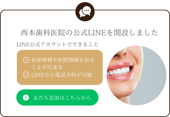 「西本歯科医院に来て良かった!」と満足して頂けるように、スタッフ一同、誠意をもって治療にあたります。どんなに些細なお悩み事でも構いませんのでお気軽にご相談ください。